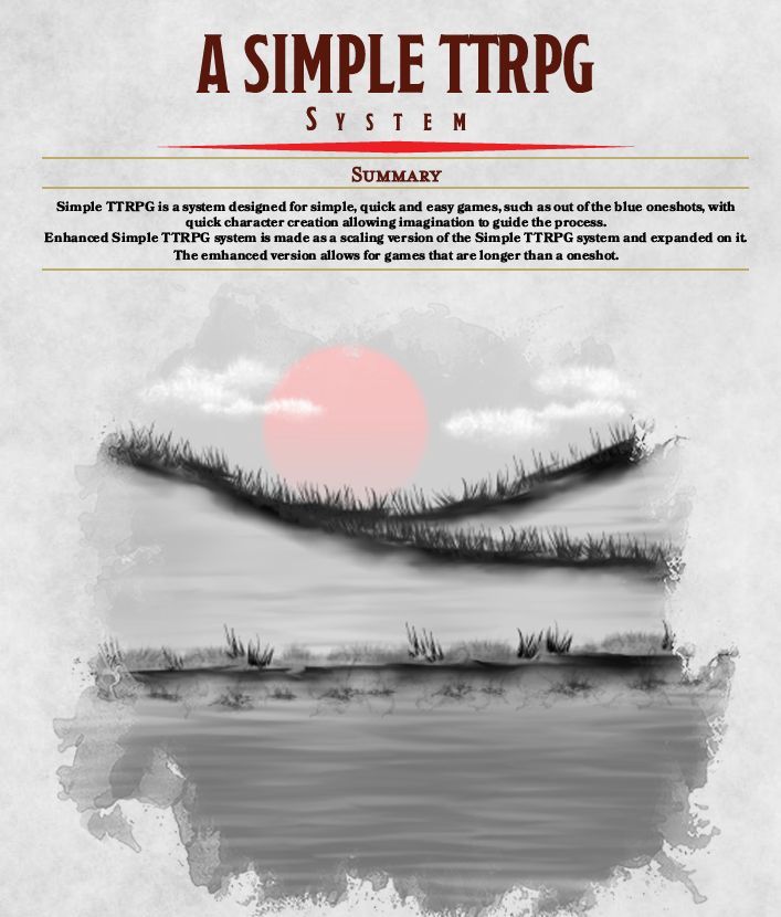 Simple TTRPG is a system designed for simple, quick and easy games, such as out of the blue one-shots, with quick character creation allowing imagination to guide the process. It is a complete, rules-light tabletop roleplaying framework made for creators and storytellers who value flexibility and speed.