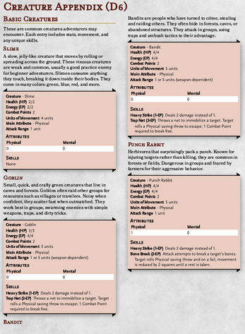 Enhanced Simple TTRPG system is made as a scaling version of the Simple TTRPG system and expanded on it. The enhanced version allows for games that are longer than a one-shot, giving players the ability to level up unlike in the Standard Simple TTRPG system